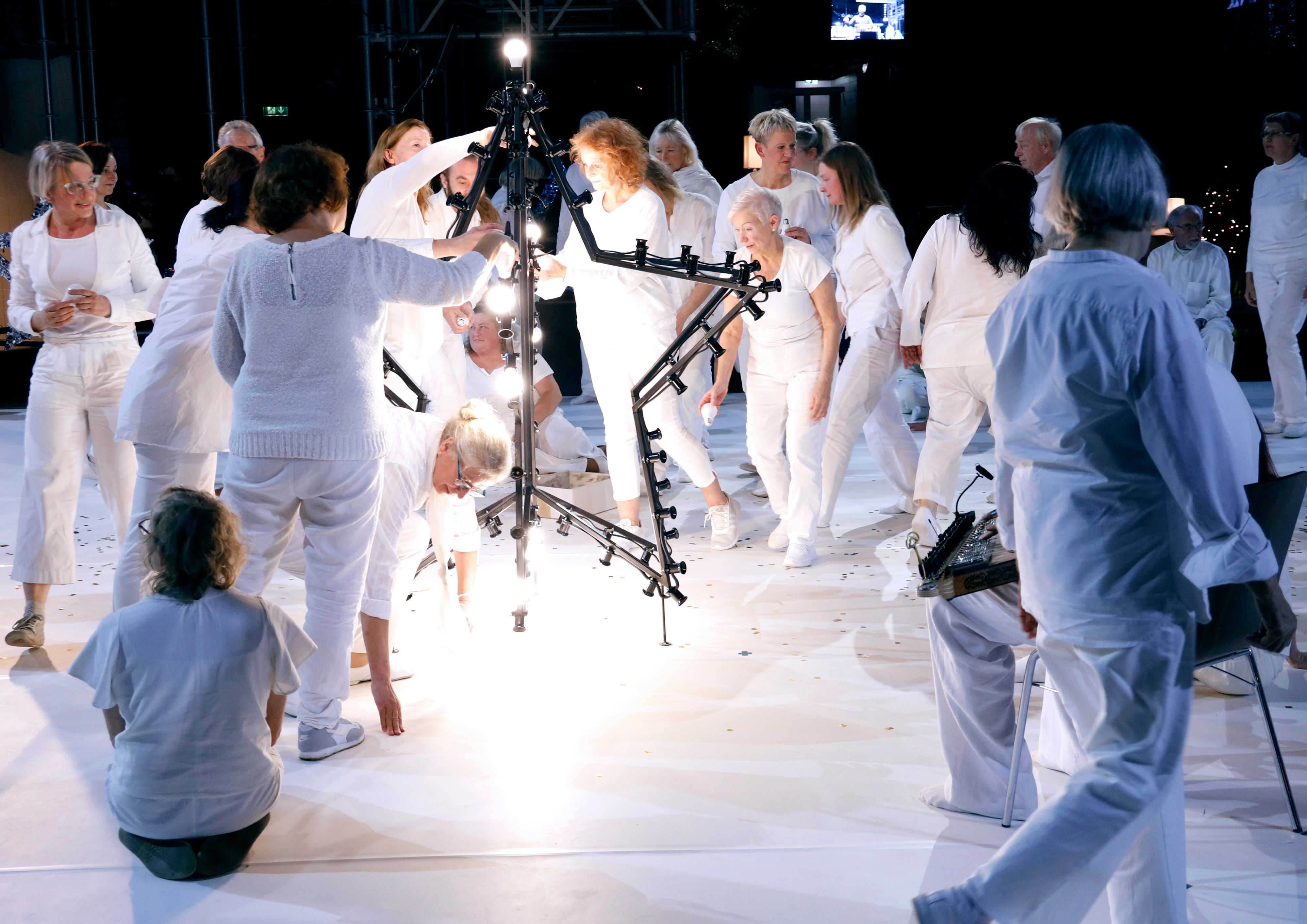 In seiner dezidierten Überladung mit Eindrücken und Aufforderungen an das Publikum – hier blinken die Sterne, da das Glitzerhemd des Evangelisten also known as Showmaster; mal soll man spenden, mal mitsingen; zugleich müssen auch noch drei Wohnräume und das Fitnessstudio im Blick behalten werden – trifft Biganzolis Inszenierung durchaus ein vorweihnachtliches Lebensgefühl und stellt an jeden einzeln die Frage: Mitmachen oder nicht?